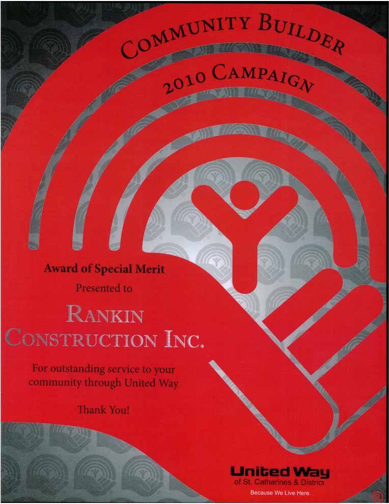 Rankin Construction was given the honor of receiving the United Way's 2010 Community Builder Award and we want to express our gratitude both to the community for this honour and to our employees for making it possible.