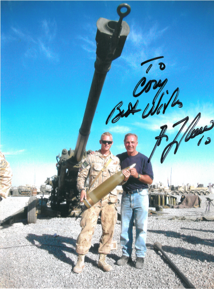 Here’s a photo of Cory with former professional NHL star Guy Lafleur holding a 155mm High Explosive round. Behind them is an M777 Howitzer, which Cory manned as an artilleryman for 8 months in Kandahar, Afghanistan with the 2nd Royal Canadian Horse Artillery.