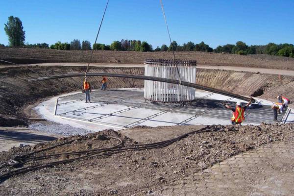 AIM PowerGen Corporations's (now International Power Canada) Erie Shores Wind Farm second phase projects. The joint venture of AMEC/Black & McDonald contracted Rankin Construction to build the wind turbine foundations and access roads for 24 wind turbines. The work also included constructing the crane pads and other access requirements. Each spread footing foundation required 27 tonnes of rebar, 320 cubic meters of concrete and accurate embedment of 120 anchor bolts. Rankin crews were completing 3 turbine bases per week in order to maintain the aggressive schedule and complete the project on time.